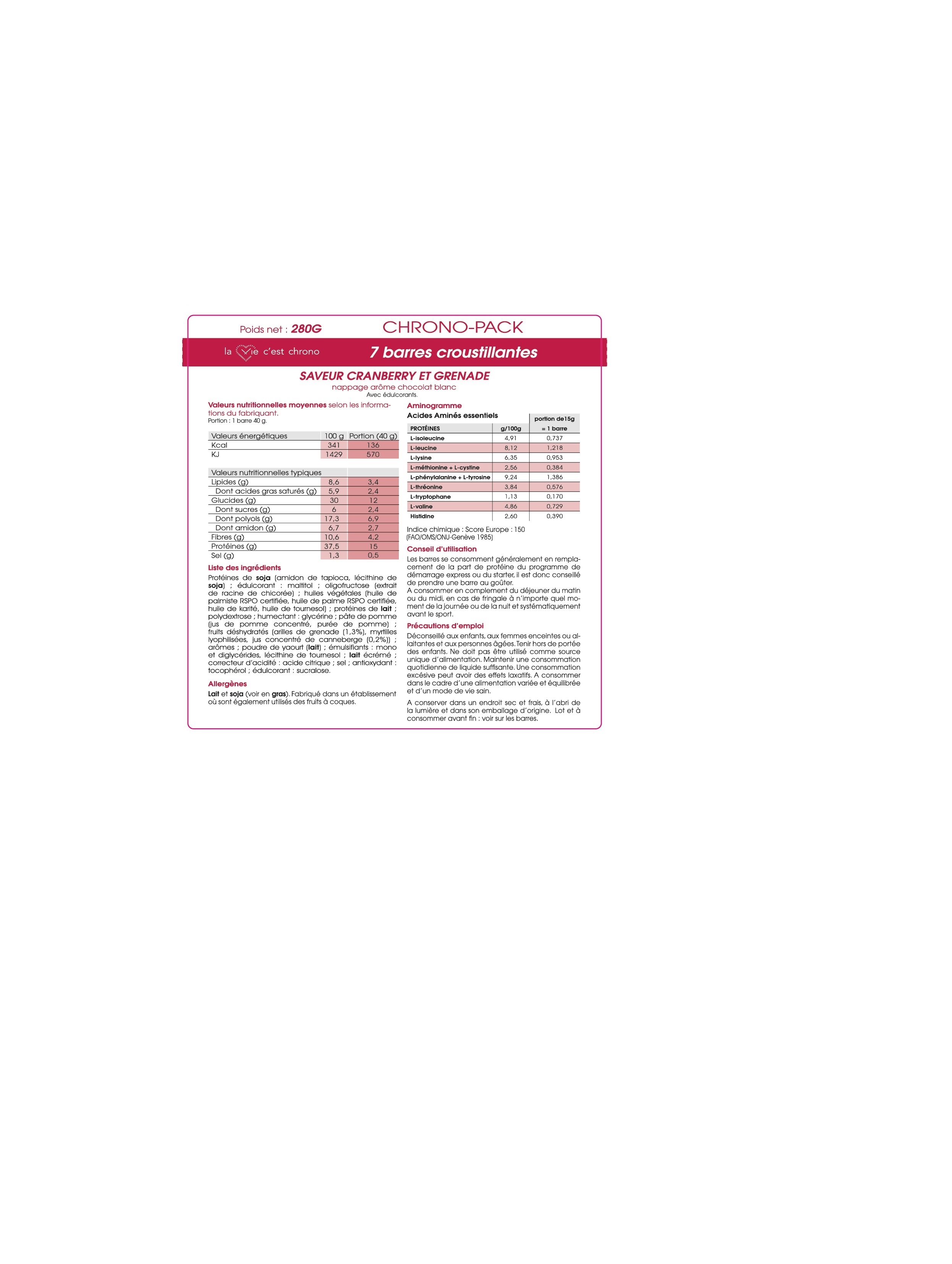 Composition : Chrono-Pack 7 Barre croustillante saveur cranberry et grenade. Mélange protéique (isolat de protéines de soja ; concentré de protéines de lacosérum (lait) ; isolat de protéines de lactosérum (lait)) ; polyol : sirop de maltitol : polyol : maltitol ; sucre ; fructooligosaccharides ; amidon de tapioca ; huile végétales (huile de palmiste, huile de colza, huile de tournesol) ; humectant : glycérine ; jus de pomme concentré ; eau ; cranberry sucré déshydraté (cranberry, sucre) (3,6 %) ; arômes ; jus concentré de cranberry (1,4 %) ; arilles de grenade (1,3 %); monoglycérides ; poudre de yaourt (ingrédients laitiers, cultures bactériennes) (lait) ; myrtilles ; correcteur d'acidé : acide citrique ; sel ; émulsifiant : lécithine de soja ; édulcorant : sucralose ; antioxydant : tocophérol