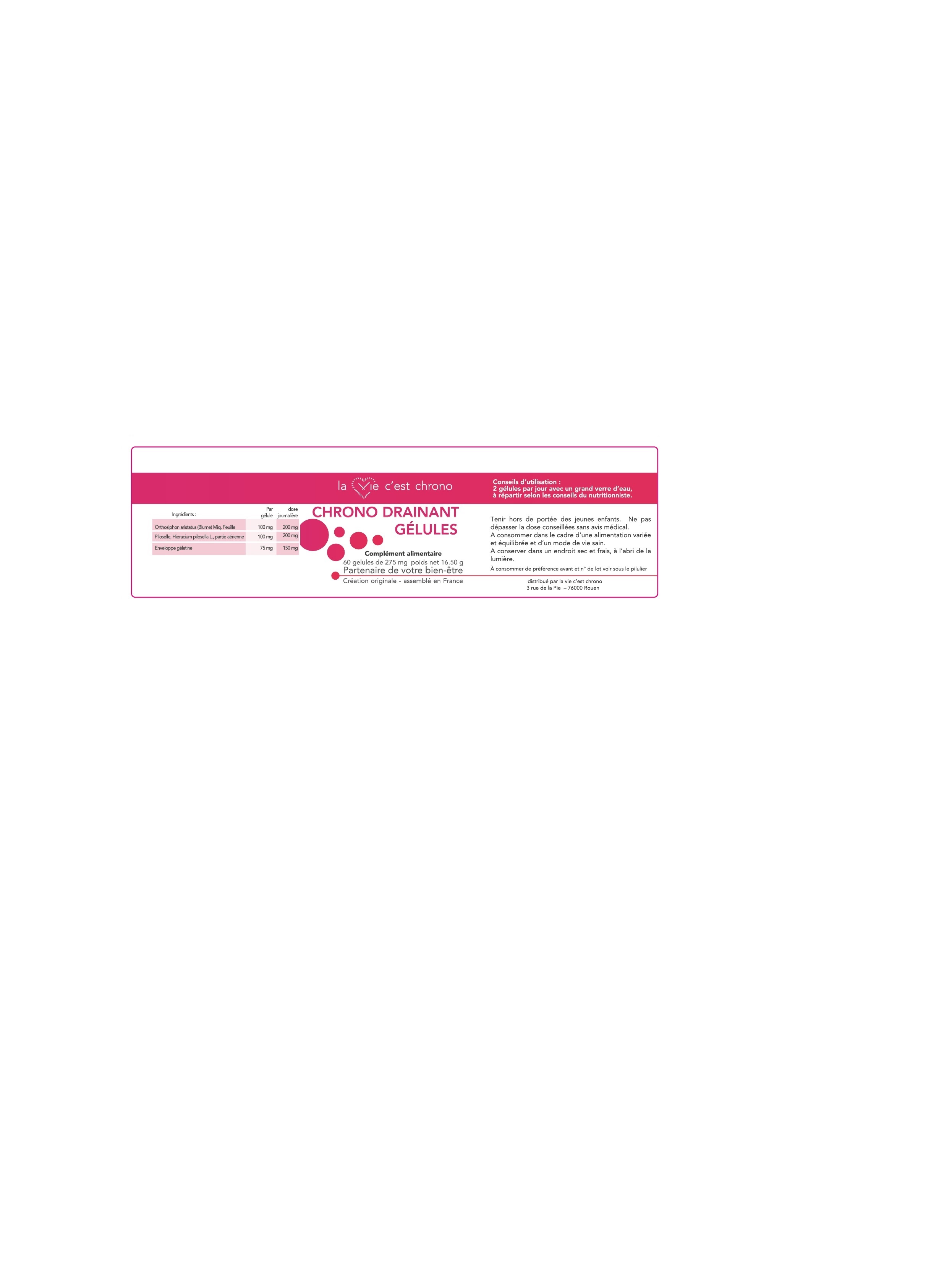 Composition : Chrono-Joker : Chardon Marie Graine Artichaud - Feuille Enveloppe gélatine Huile de Bourrache microencapsulée Levure de bière active Acide L-Aspartique Chrono-Drainant Gélules : Orhosiphon Aristatus (Blume) Piloselle, Hieracium pilosella L, parie aérienne Enveloppe gélatine (voir les fiches techniques du chrono-pack)