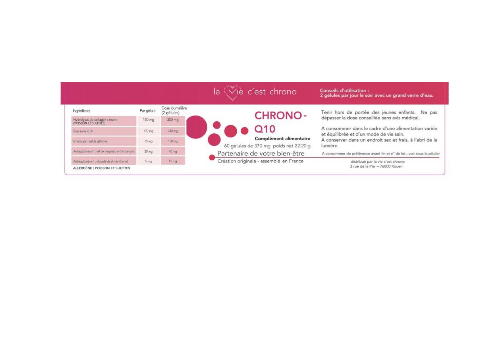 Composition : Hydrolysat de collagène marin (poisson et sulfites) 150mg par gélule Coenzyme Q10 120 mg par gélule Enveloppe : gélule gélatine Antiagglomérant : sel de magnésium d’acide gras 20 mg par gélule Antiagglomérant : dioxyde de silicium 5mg par gélule